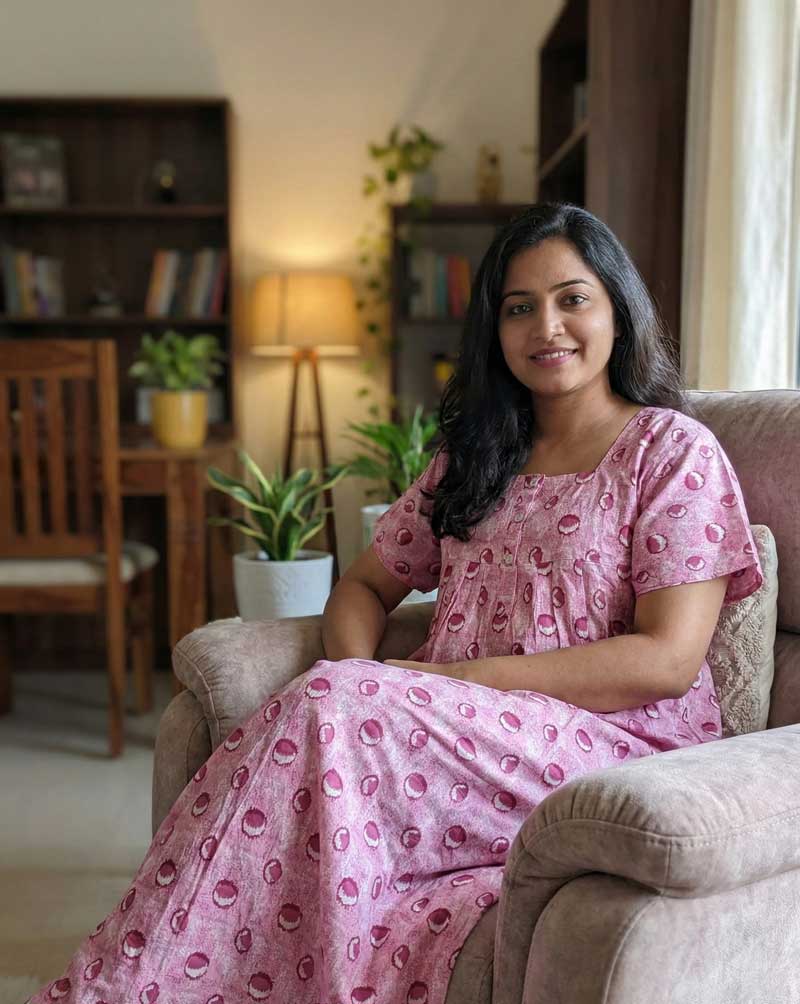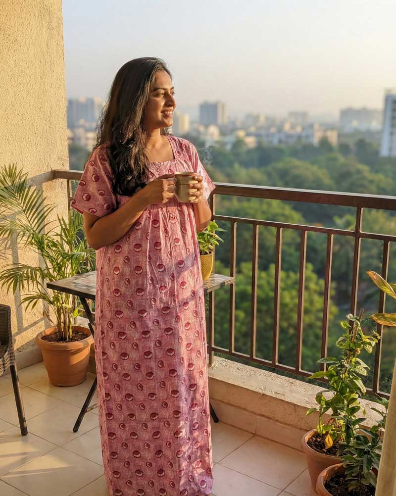 This nighty can be hand washed or a normal machine washed with cold water. Please make sure to dry the nighty in a light shade away from direct sunlight.