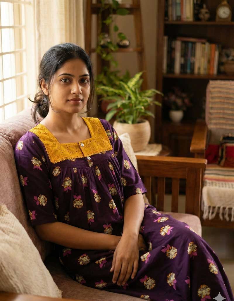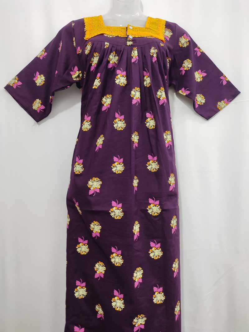 Comfortable Front Open Cotton Nighty With Buttons, Hakoba Yoke, 3/4th Sleeves – 55 inches long – Purple