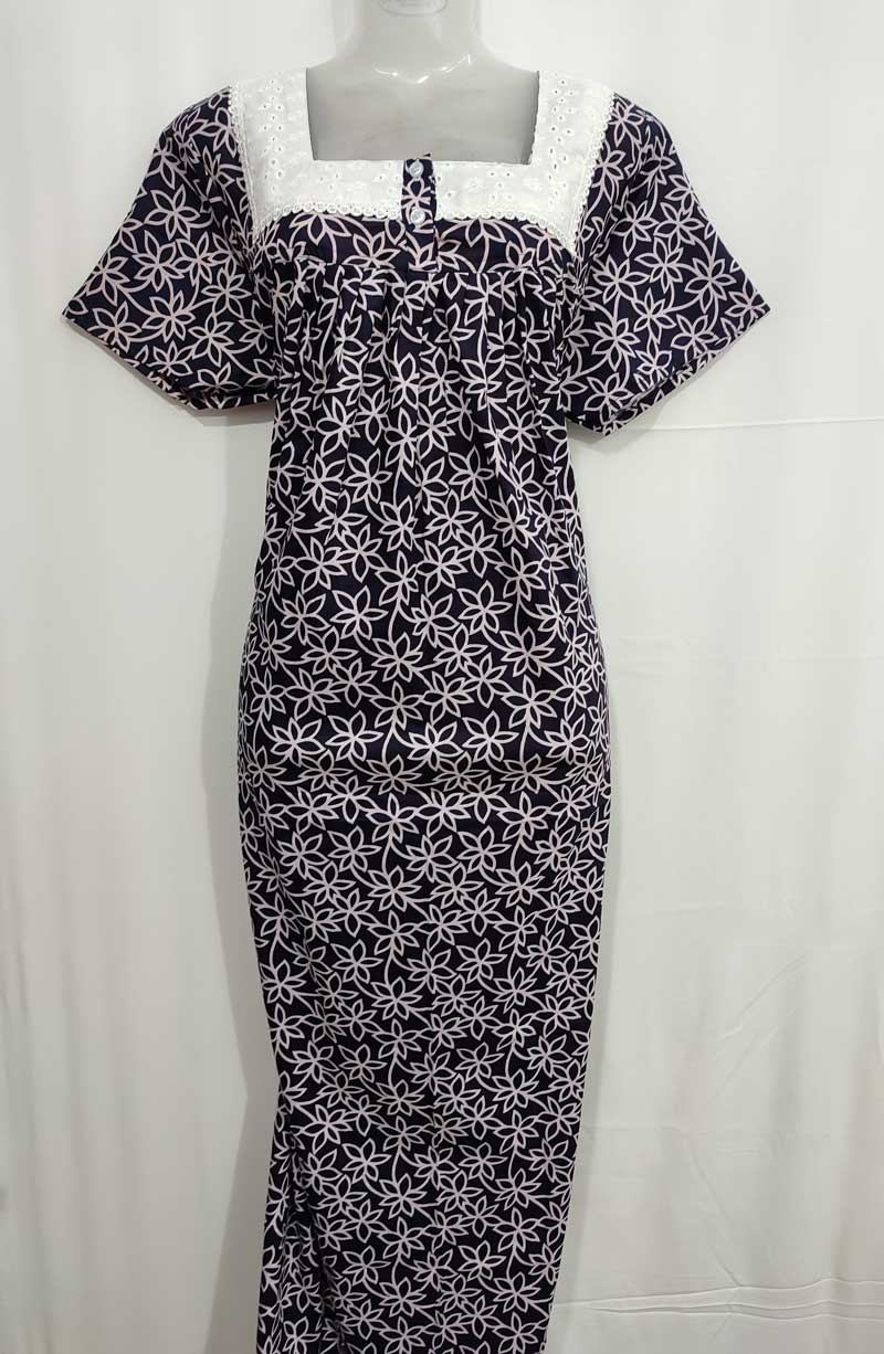 Comfortable Front Open Cotton Nighty With Buttons, Hakoba Yoke – 55 inches long – Dark Blue