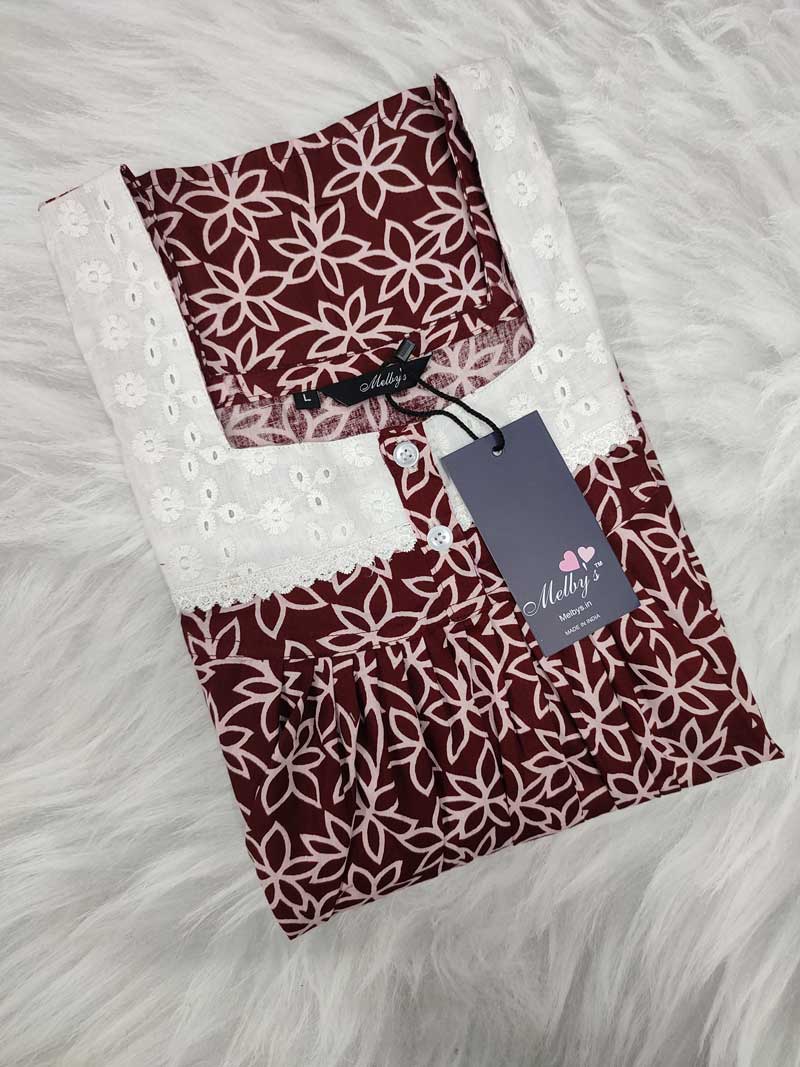 Comfortable Front Open Cotton Nighty With Buttons, Hakoba Yoke – 55 inches long – Maroon