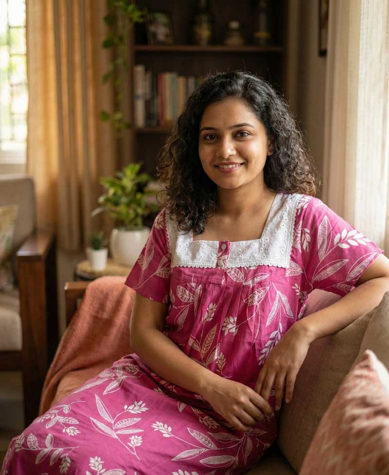 Comfortable Front Open Cotton Nighty With Buttons, Hakoba Yoke – 55 inches long – Rose