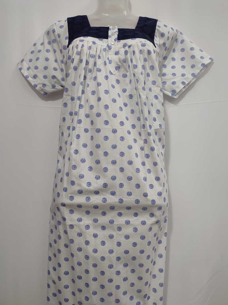 Comfortable Front Open Cotton Nighty With Buttons, Hakoba Yoke – 55 inches long – White & Blue