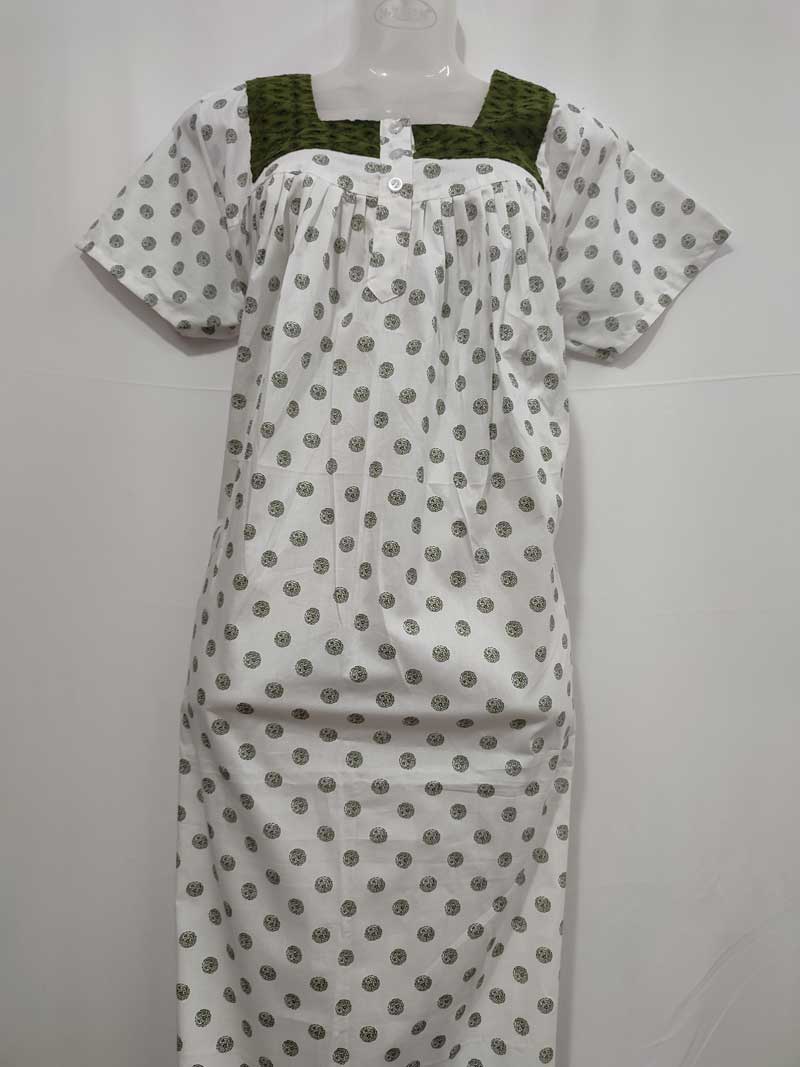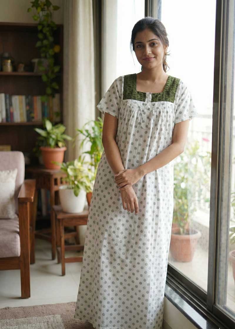 Comfortable Front Open Cotton Nighty With Buttons, Hakoba Yoke – 55 inches long – White & Green