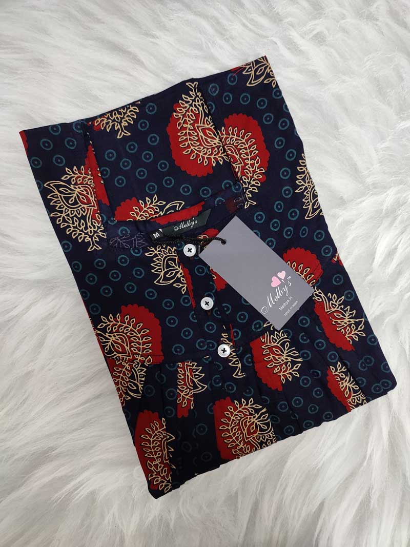 Front open Ajrak cotton nighty, 55 Inches Long – Dark Blue