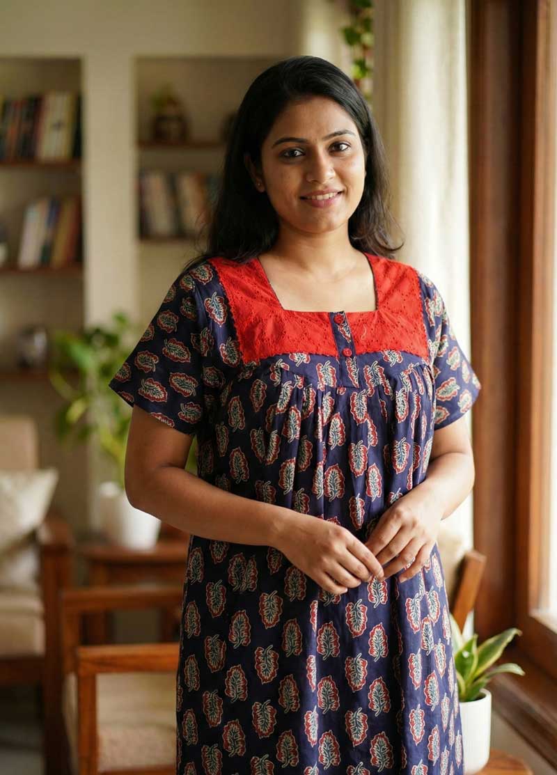 This nighty can be hand washed or a normal machine washed with cold water. Please make sure to dry the nighty in a light shade away from direct sunlight.