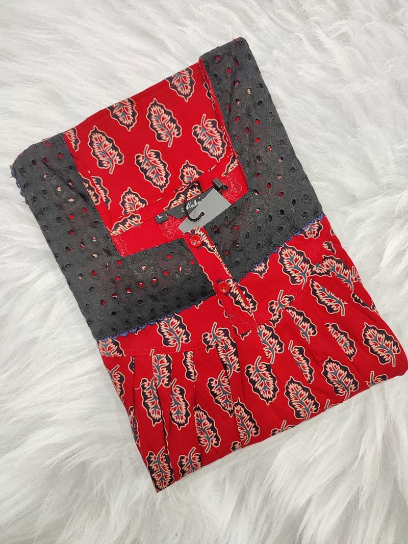 Front Open Ajrak Cotton Nighty With Buttons, 55 Inches Long, Square Hacoba Neck – Red
