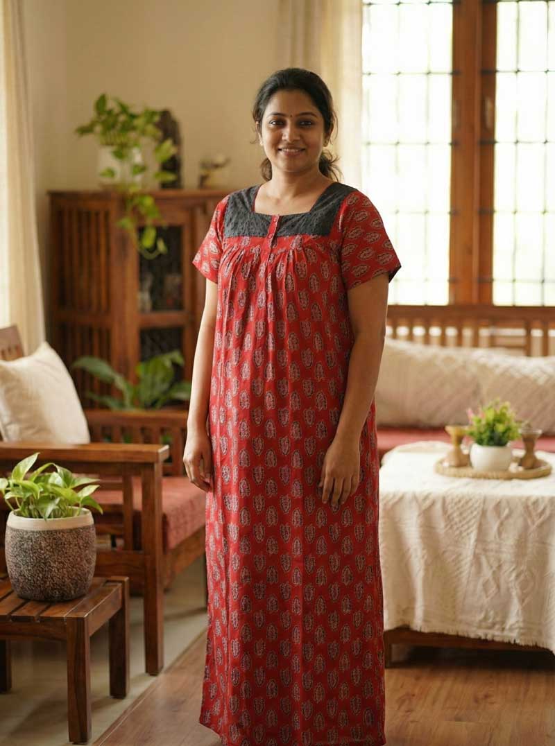 This nighty can be hand washed or a normal machine washed with cold water. Please make sure to dry the nighty in a light shade away from direct sunlight.