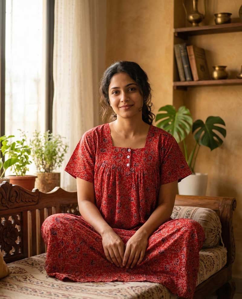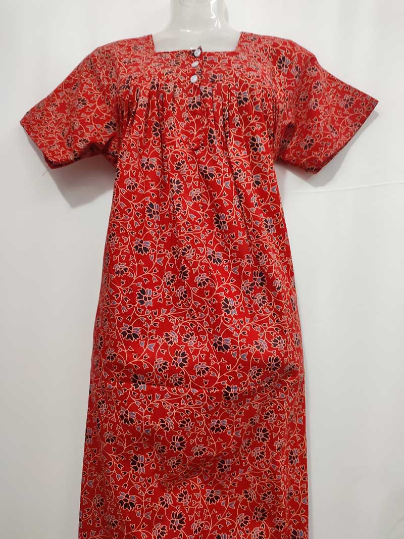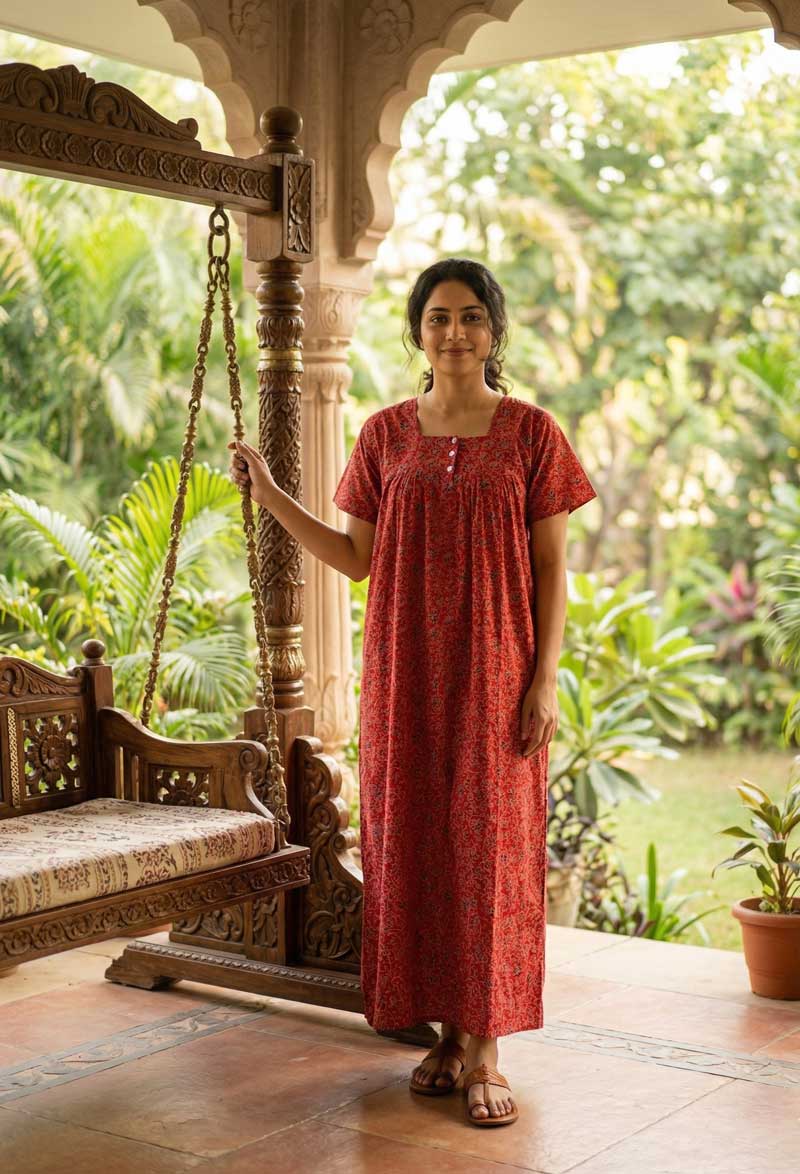 Front Open Ajrakh Nighty With Buttons, 55 Inches – Red