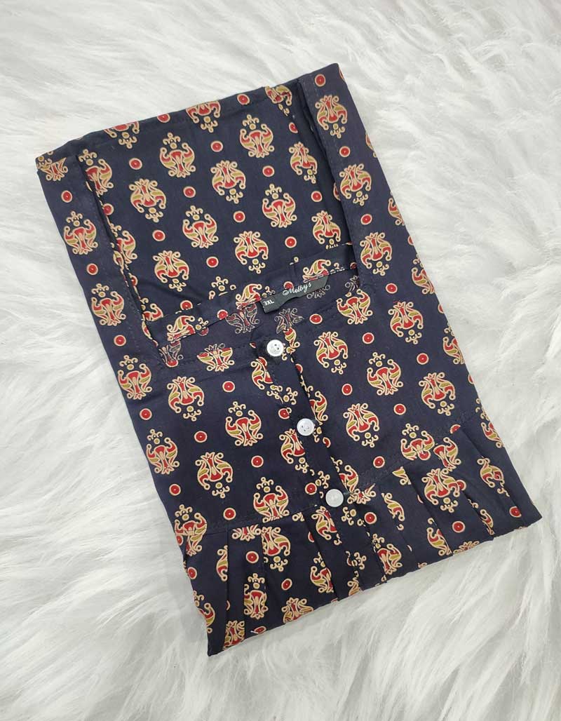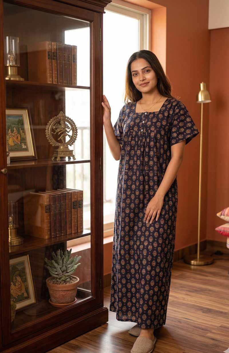 Front Open Ajrakh Nighty With Buttons, 57 Inches – Black