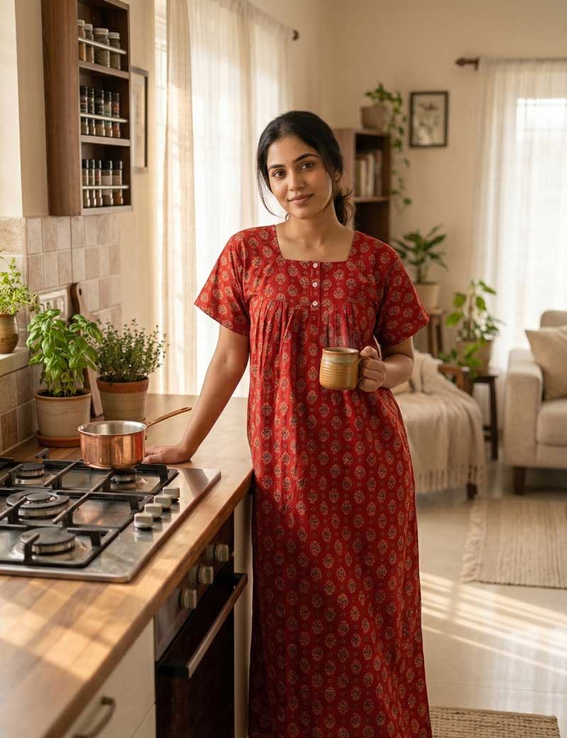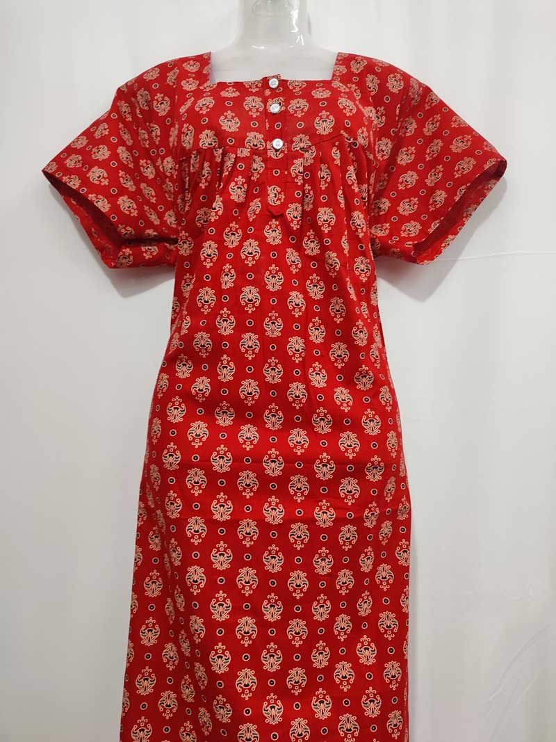 Front Open Ajrakh Nighty With Buttons, 57 Inches – Red