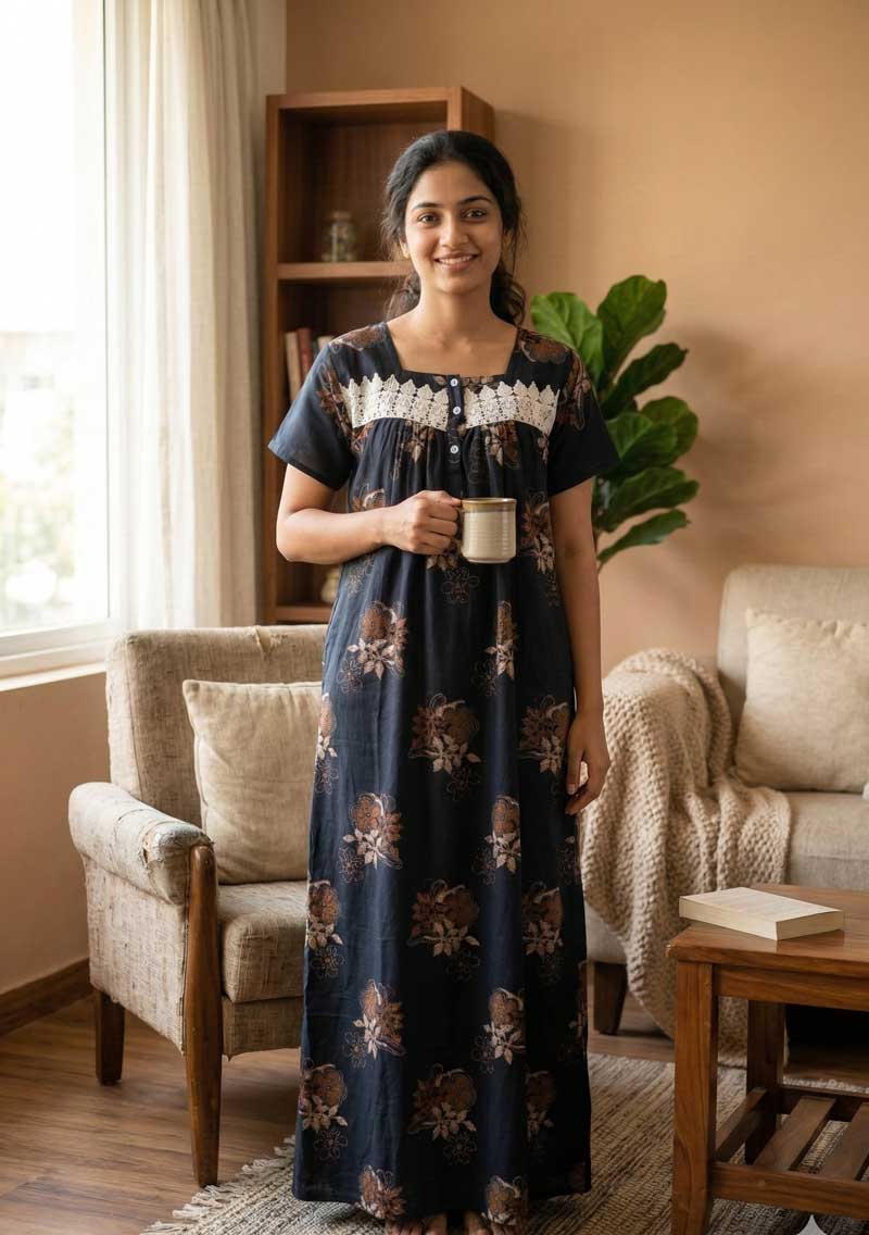 This nighty can be hand washed or a normal machine washed with cold water. Please make sure to dry the nighty in a light shade away from direct sunlight.