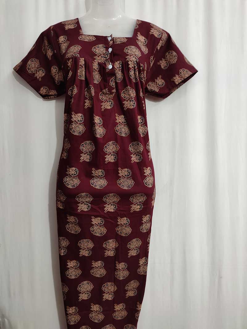 Front Open Cotton Nighty With Buttons, 55-57 Inches Long – Maroon