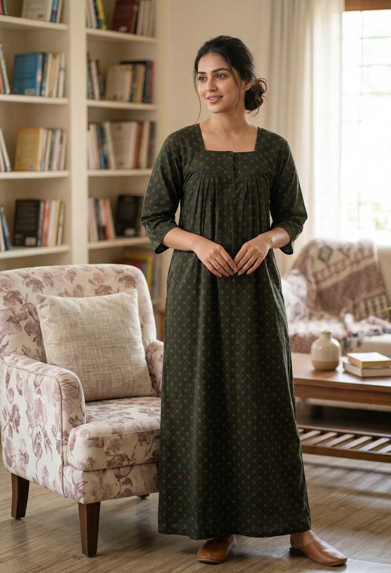 Front Open Cotton Nighty With Buttons, 55 Inches, 3/4th Sleeves – Dark Green