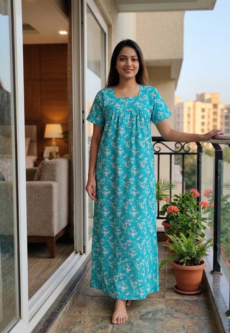 Front Open Cotton Nighty With Buttons, 55 Inches – Blue