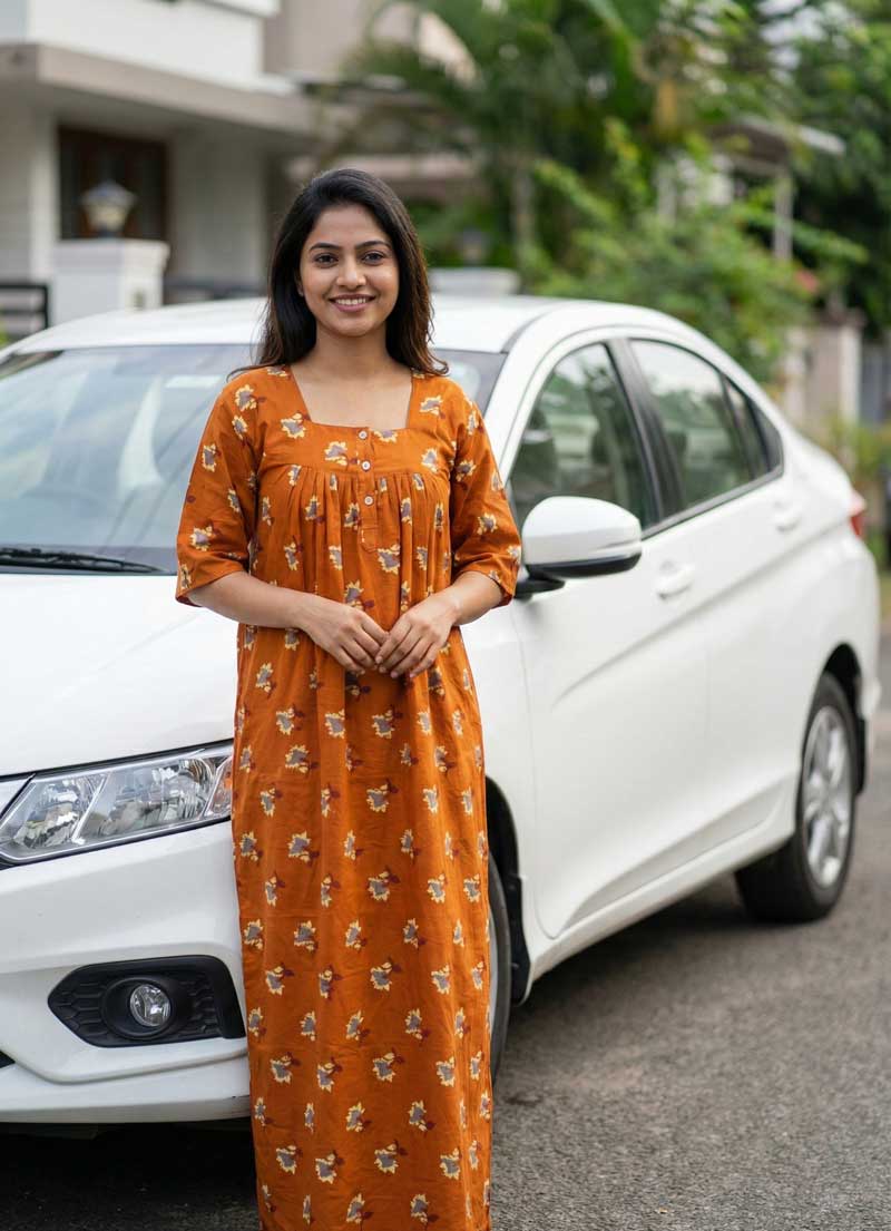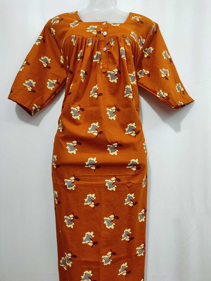Front Open Cotton Nighty With Buttons, 55 Inches Long, 3/4th Sleeves – Orange