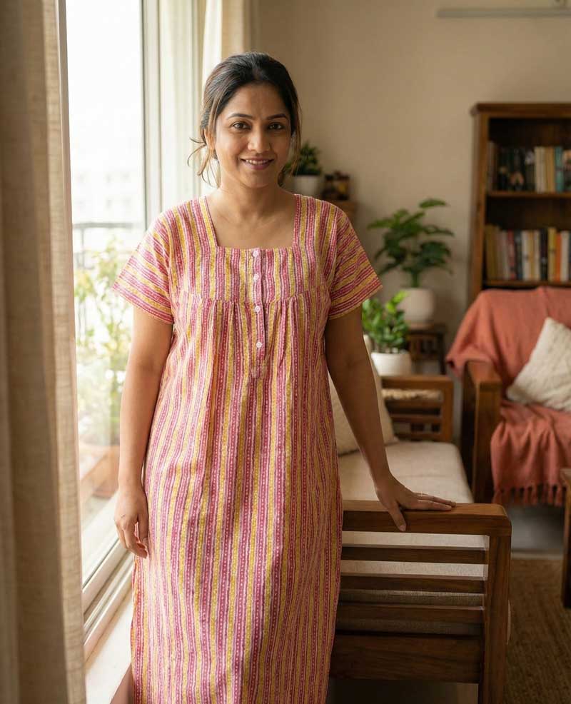 Premium Cambric Cotton Nighty With Long Sleeves – Buttons Type