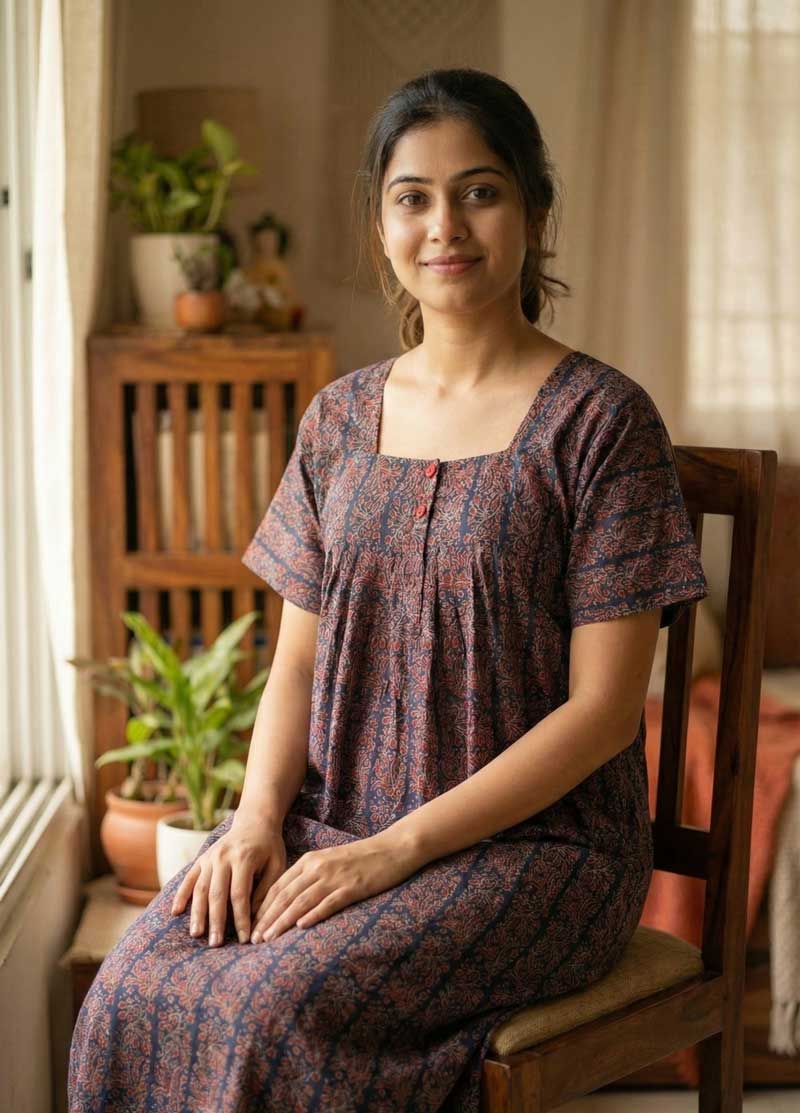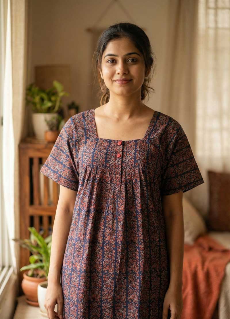 This nighty can be hand washed or a normal machine washed with cold water. Please make sure to dry the nighty in a light shade away from direct sunlight.