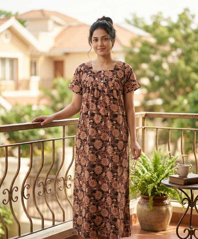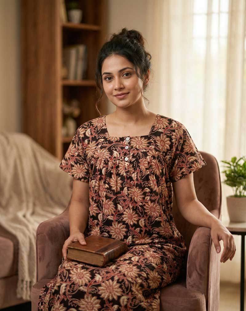 This nighty can be hand washed or a normal machine washed with cold water. Please make sure to dry the nighty in a light shade away from direct sunlight.