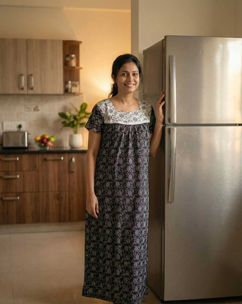 This nighty can be hand washed or a normal machine washed with cold water. Please make sure to dry the nighty in a light shade away from direct sunlight.