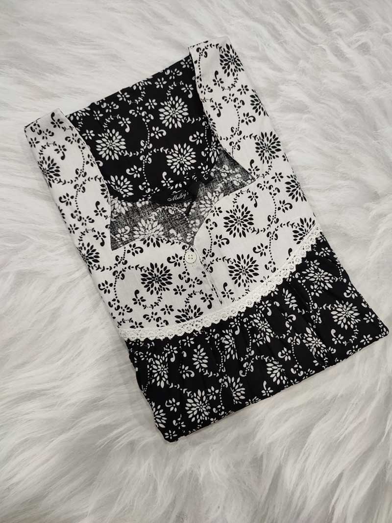 Front Open Cotton Nighty With Buttons, 55 Inches Long – Black + White