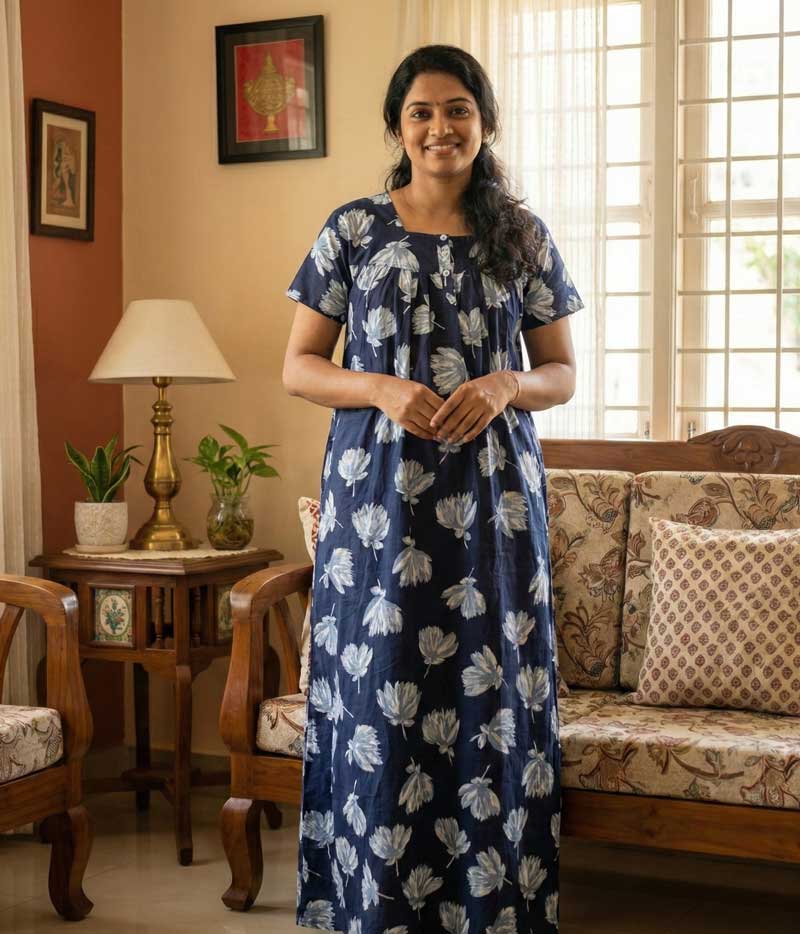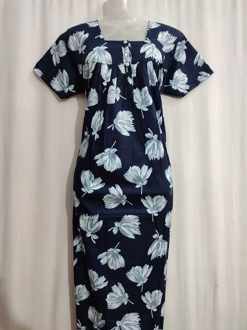 Comfortable Cotton Nighty With Buttons, 57 Inches Long – Blue
