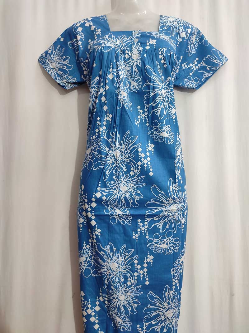 Front Open Cotton Nighty With Buttons, 55 Inches Long – Blue