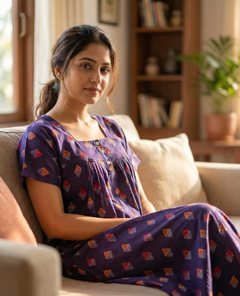 This nighty can be hand washed or a normal machine washed with cold water. Please make sure to dry the nighty in a light shade away from direct sunlight.