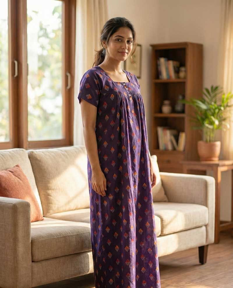 Premium Cambric Cotton Nighty With Long Sleeves – Buttons Type