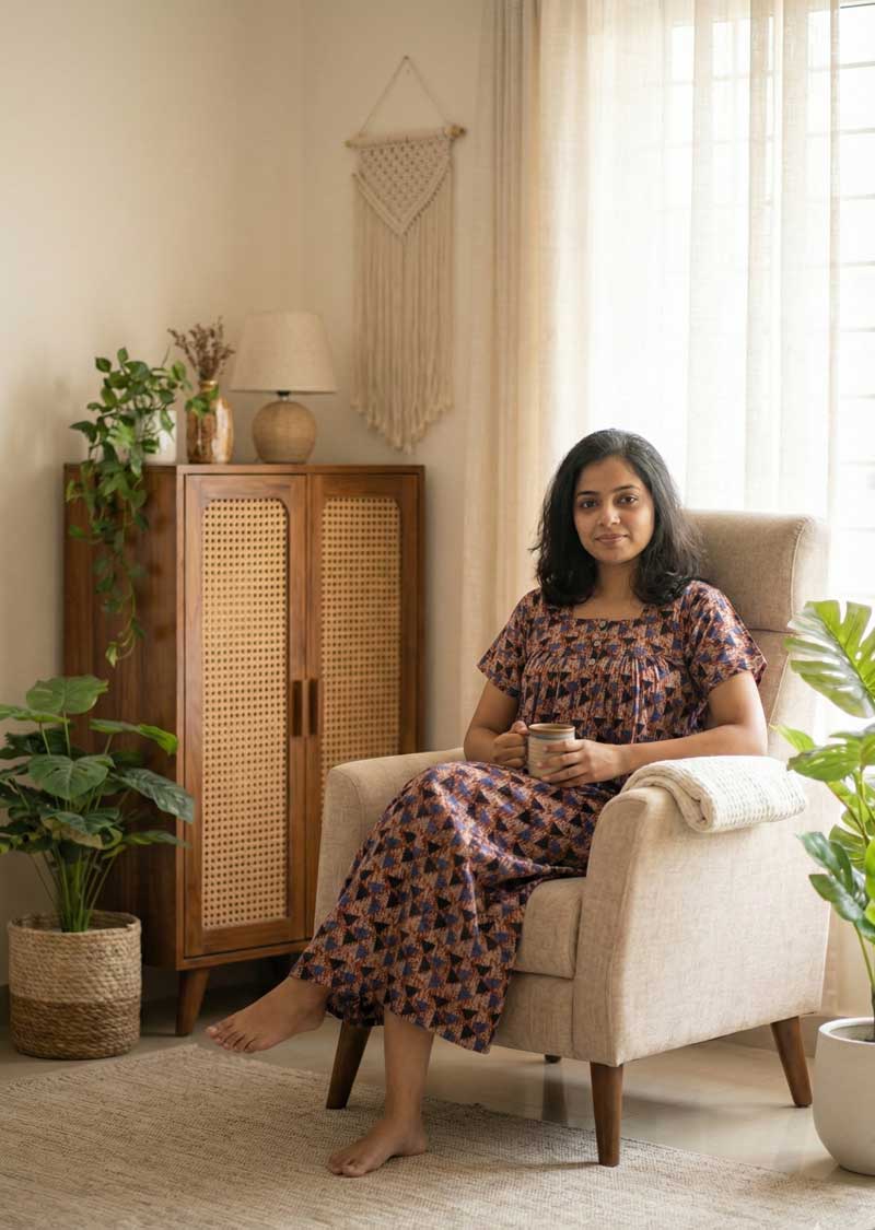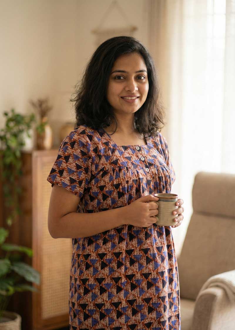 This nighty can be hand washed or a normal machine washed with cold water. Please make sure to dry the nighty in a light shade away from direct sunlight.