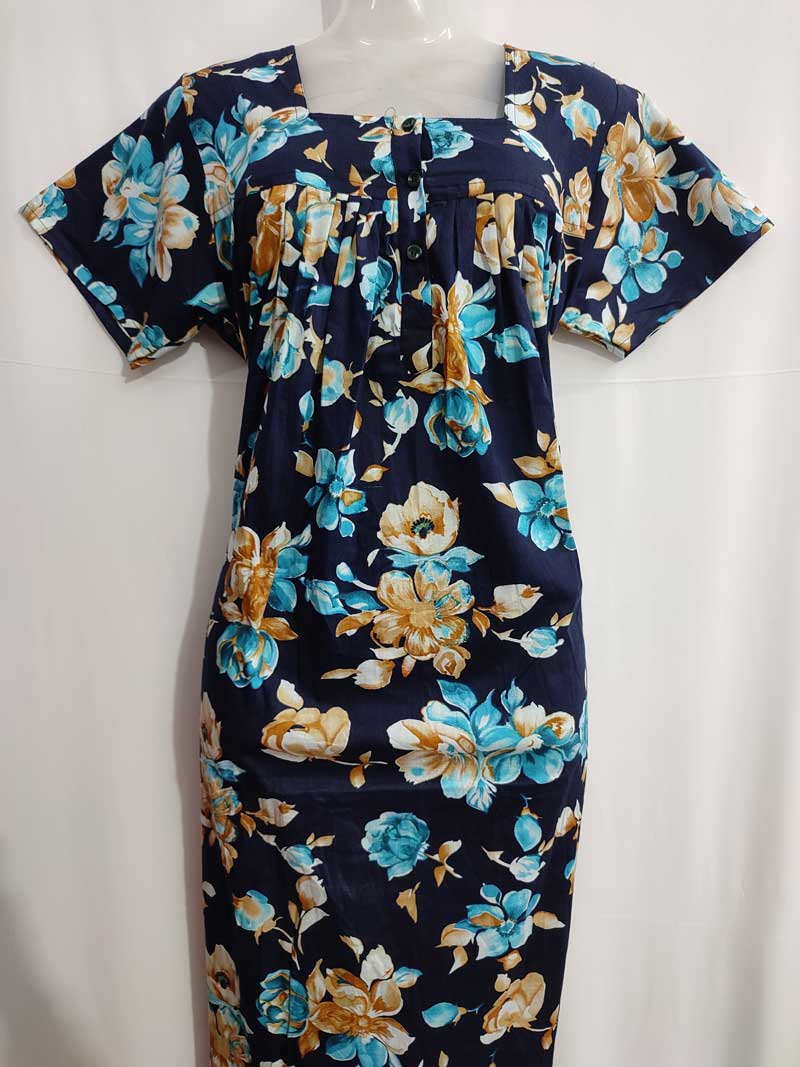 Front Open Cotton Nighty With Buttons, 55 Inches Long – Blue Flowers