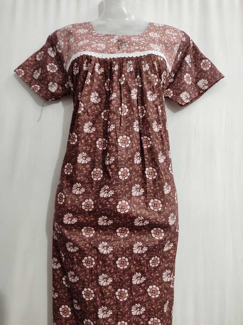 Front Open Cotton Nighty With Buttons, 55 Inches Long – Brown