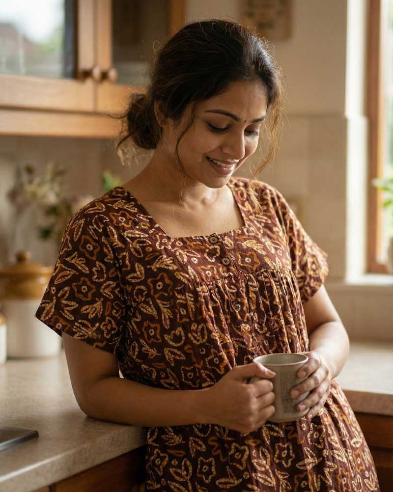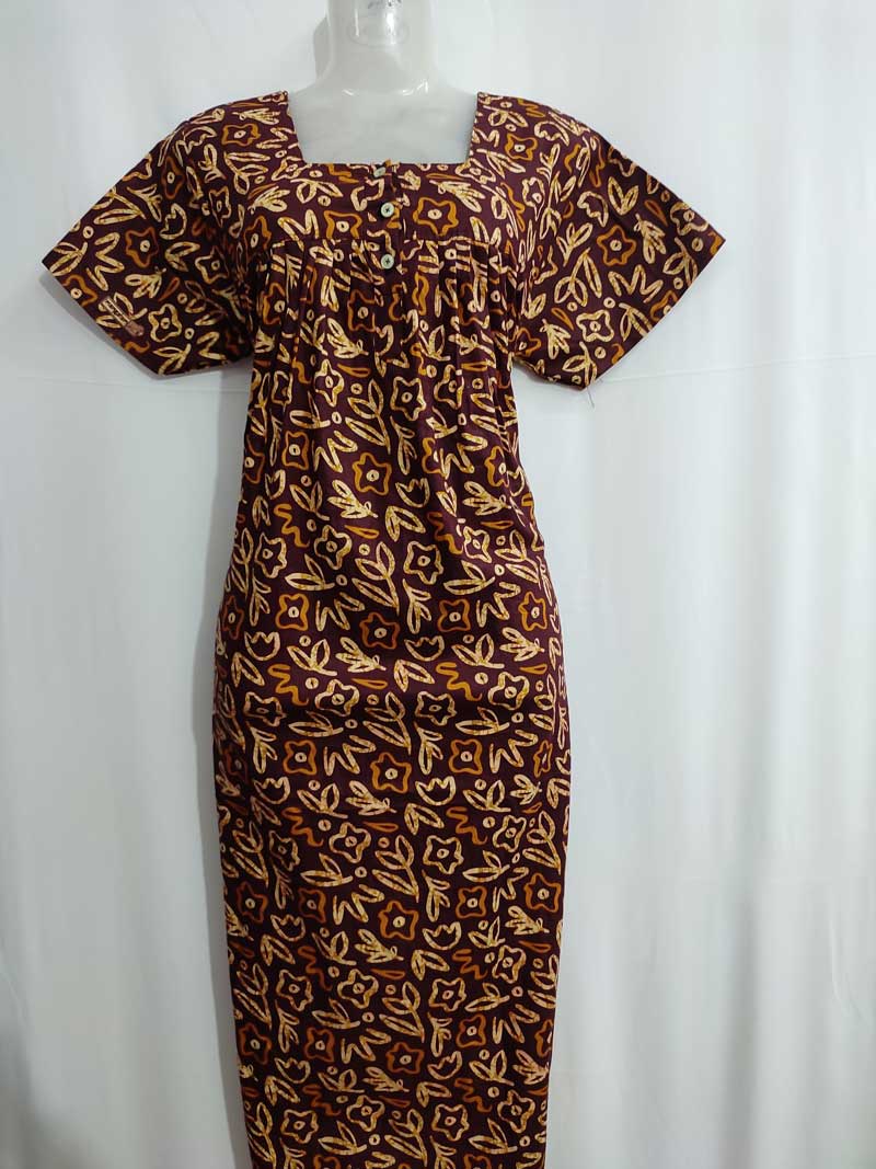 Front Open Cotton Nighty With Buttons, 55 Inches Long – Brown
