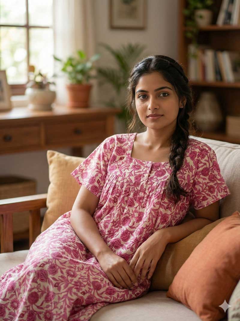 This nighty can be hand washed or a normal machine washed with cold water. Please make sure to dry the nighty in a light shade away from direct sunlight.