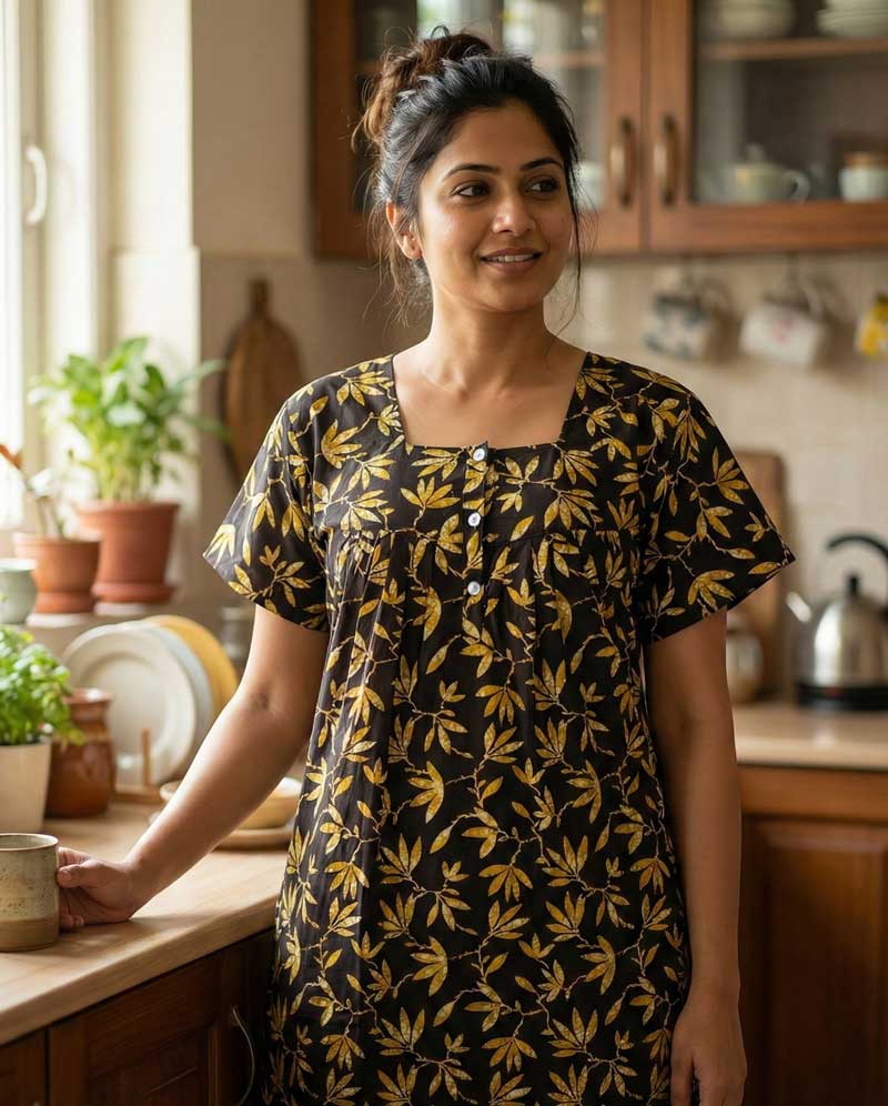 This nighty can be hand washed or a normal machine washed with cold water. Please make sure to dry the nighty in a light shade away from direct sunlight.