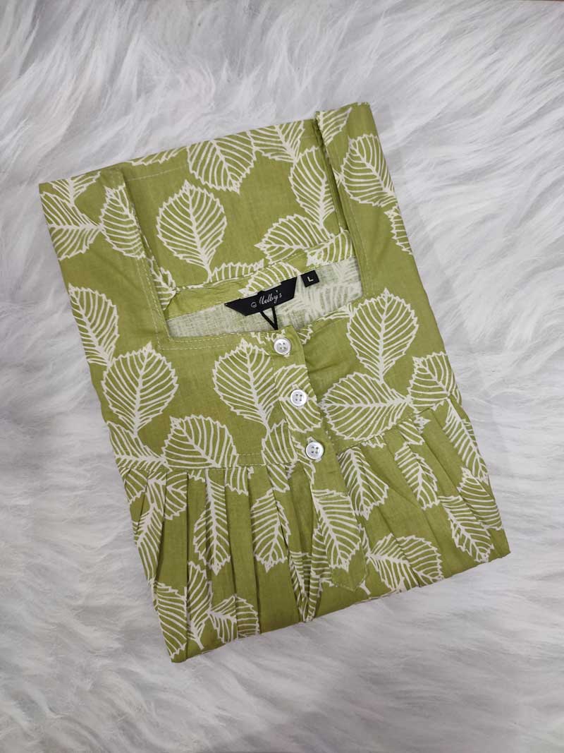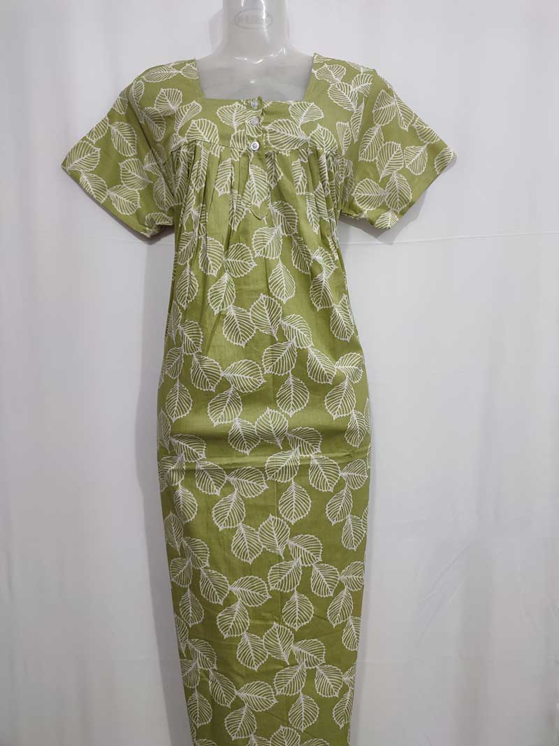 Front Open Fabric Cotton Nighty With Buttons, 55 Inches Long – Green