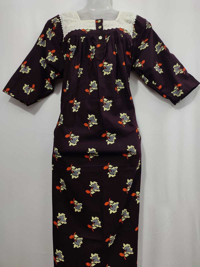 Front Open Cotton Nighty With Buttons, 55 Inches Long, Hakoba Yoke, 3/4th Sleeves – Brown