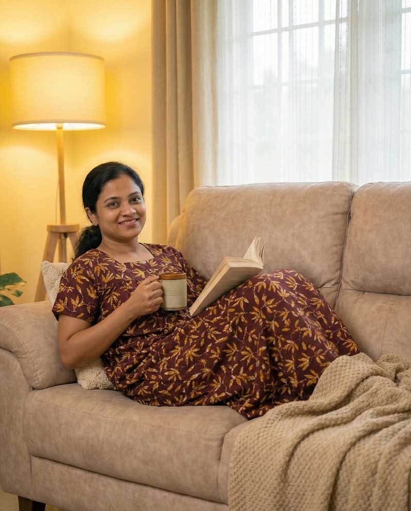 This nighty can be hand washed or a normal machine washed with cold water. Please make sure to dry the nighty in a light shade away from direct sunlight.