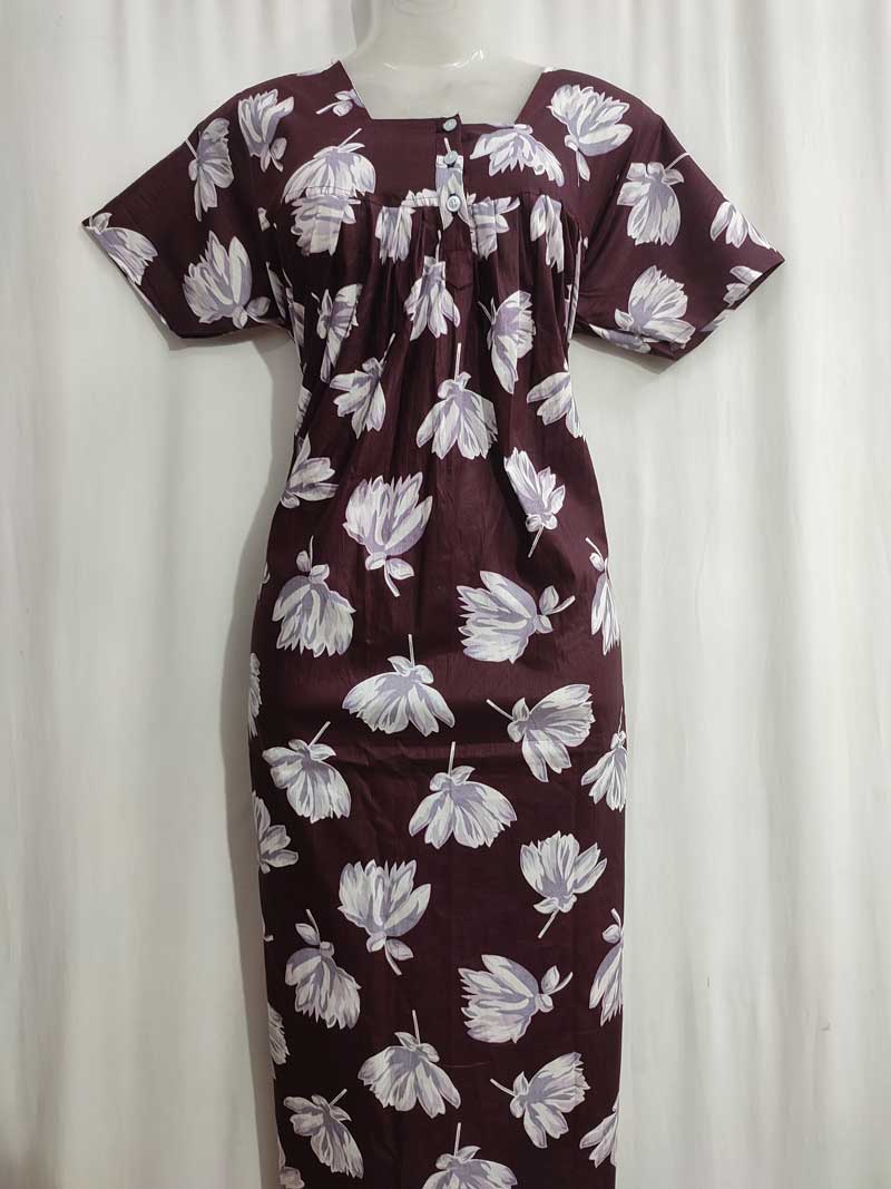 Front Open Cotton Nighty With Buttons, 55 Inches Long – Maroon