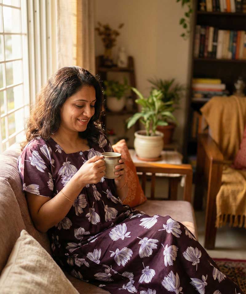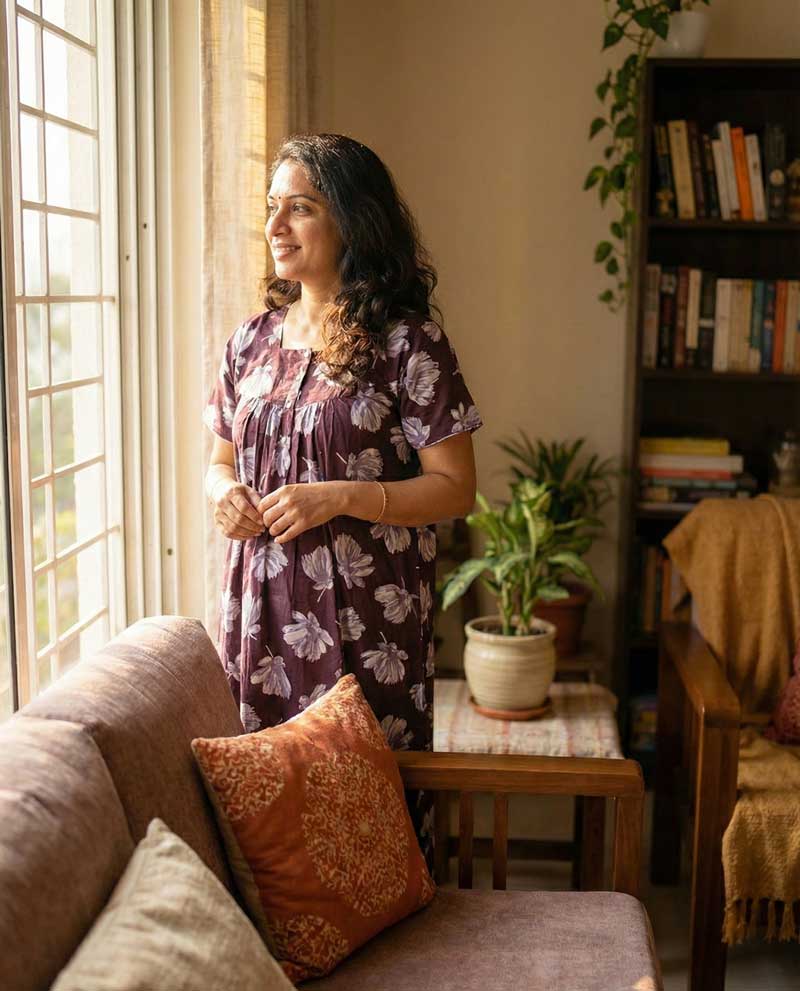 This nighty can be hand washed or a normal machine washed with cold water. Please make sure to dry the nighty in a light shade away from direct sunlight.