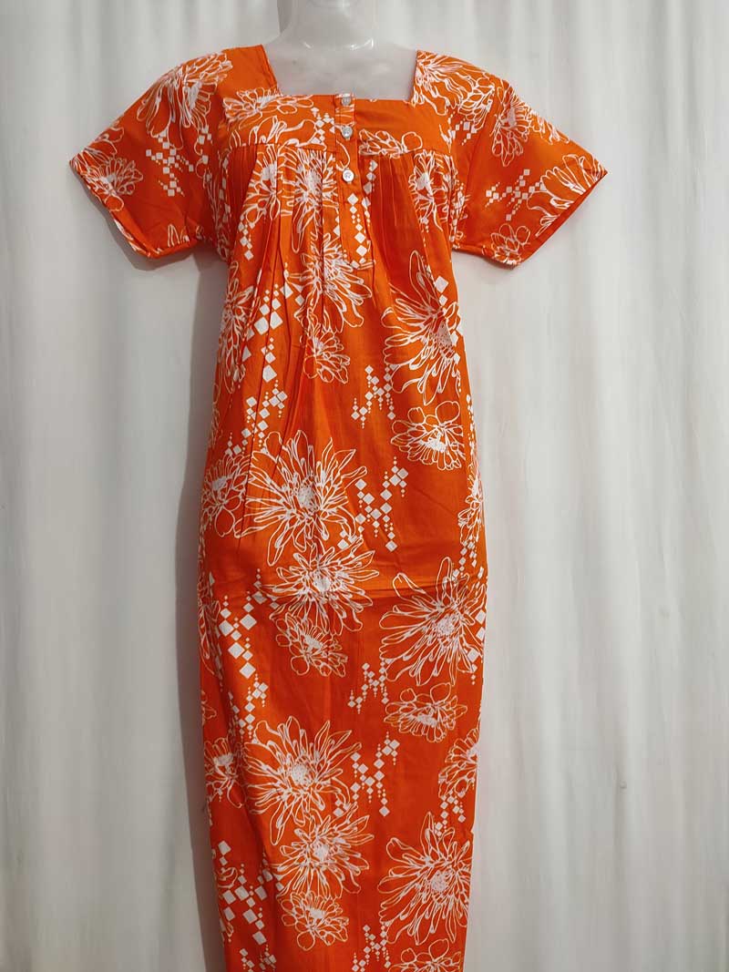 Front Open Cotton Nighty With Buttons, 55 Inches Long – Orange