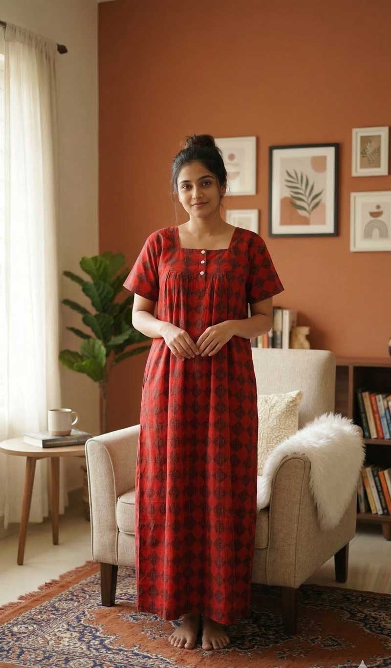 Comfortable Churidar Model cambric cotton nighty -55 inches long – Black + Red