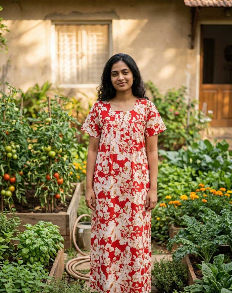 This nighty can be hand washed or a normal machine washed with cold water. Please make sure to dry the nighty in a light shade away from direct sunlight.