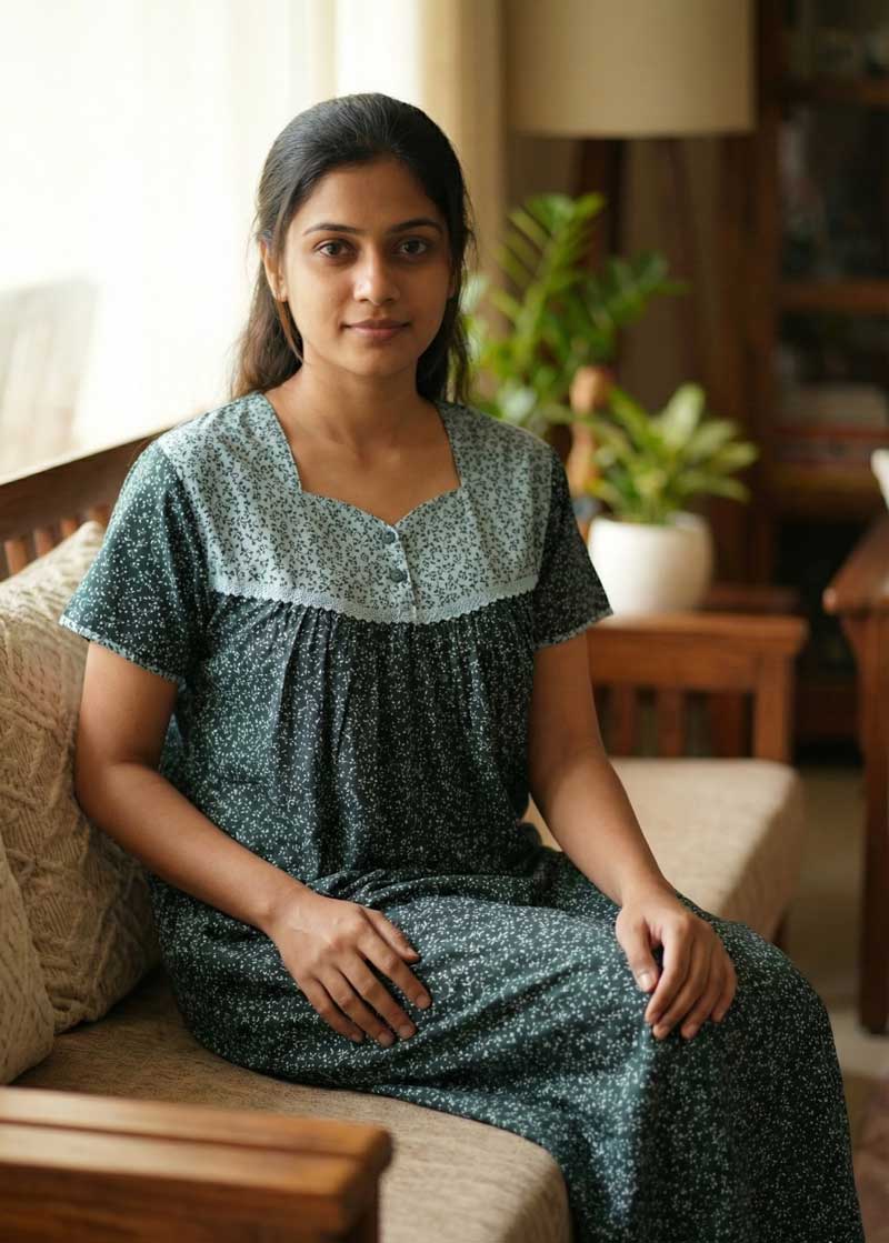 Comfortable Cotton Nighty With Buttons -57 Inches Long- Green