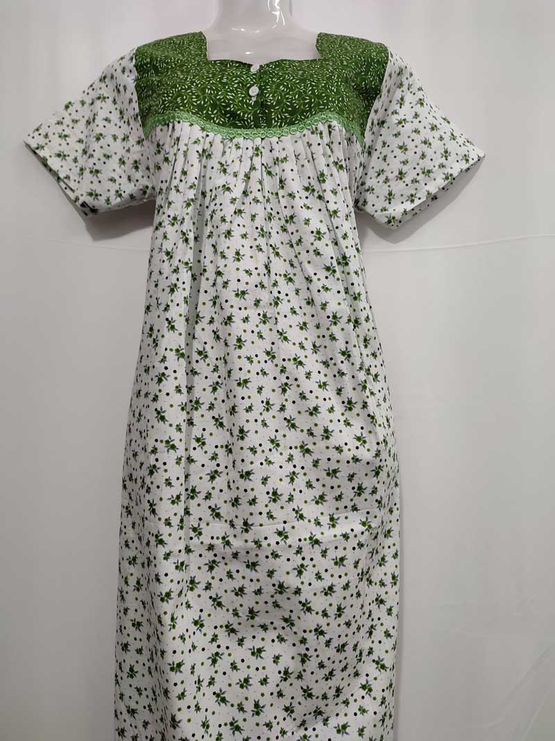 Front Open Cotton Nighty With Buttons, 55 Inches – White + Green