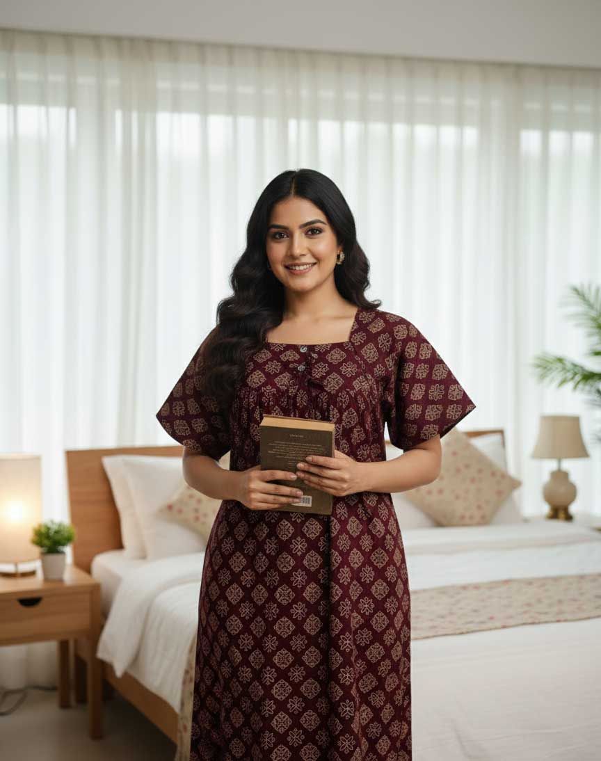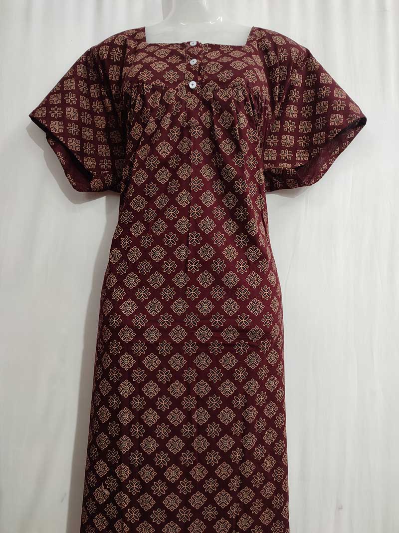 Premium Cambric Cotton Nighty With Long Sleeves – Buttons Type – Maroon