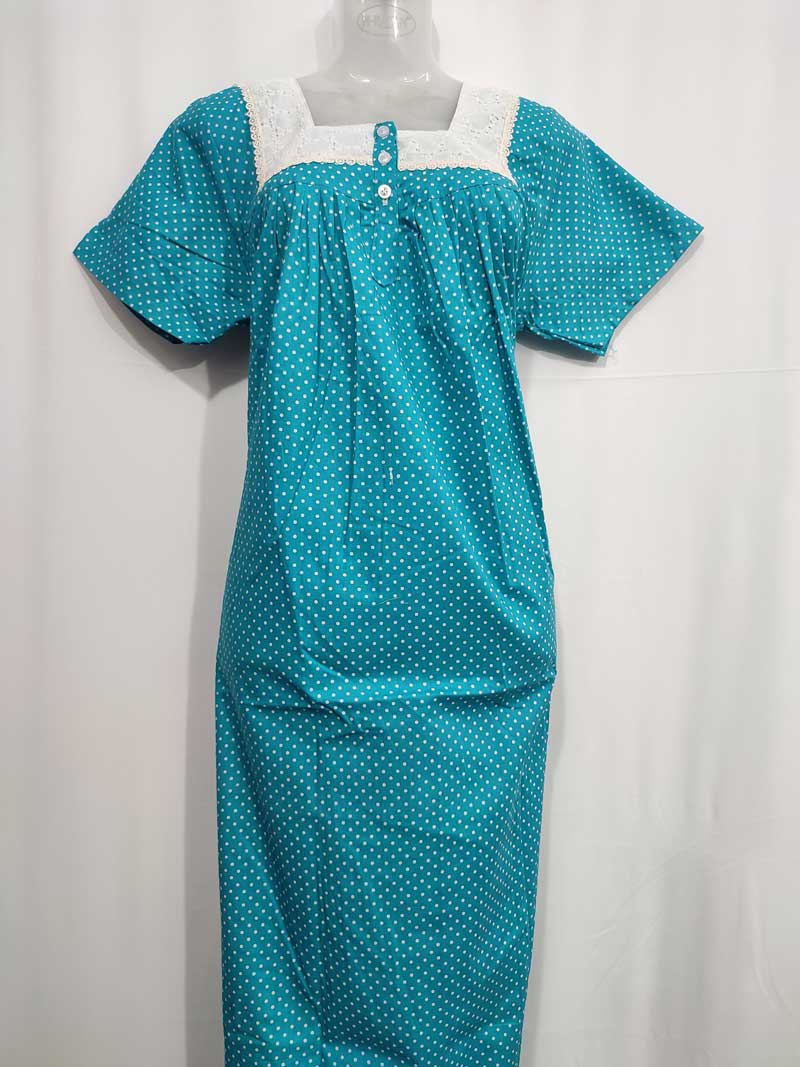 Front Open Cotton Nighty With Buttons, Hacoba Yoke, 55 Inches – Blue