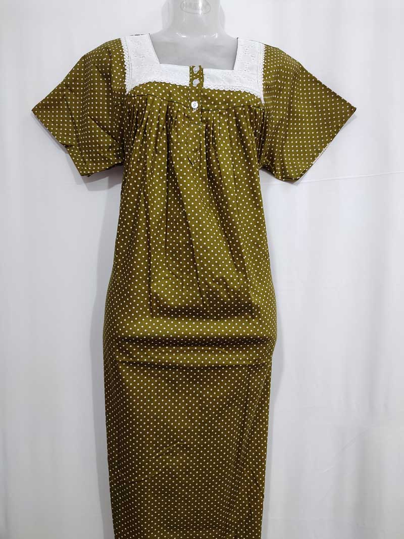 Front Open Cotton Nighty With Buttons, Hacoba Yoke, 55 Inches