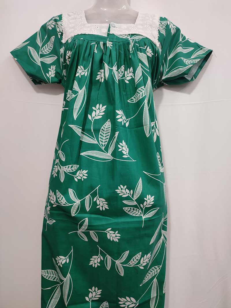 Front Open Cotton Nighty With Buttons, Hakoba yoke, 55 Inches Length – Green Colour