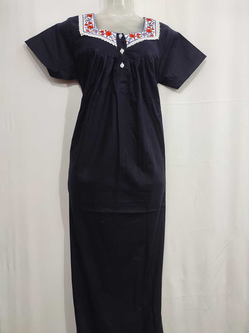 Front Open Cotton Nighty With Embroidary Neck, 55 Inches Long – Blue