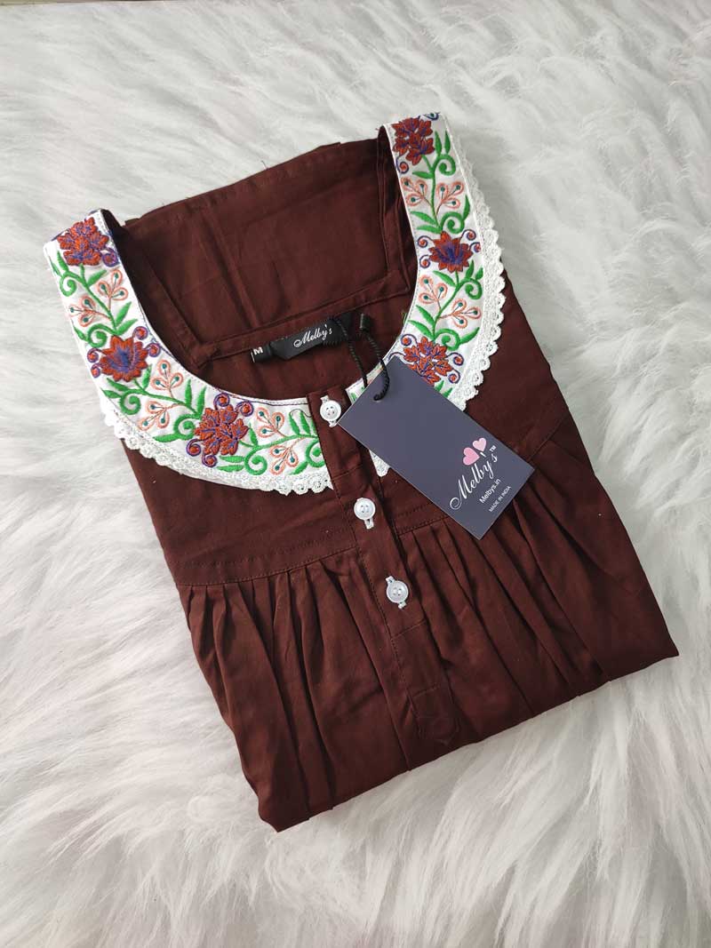 Front Open Cotton Nighty With Embroidary Neck, 55 Inches Long – Coffee Brown